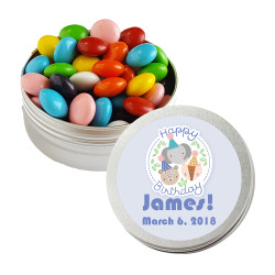 Round tin box with a twist lid, filled with your choice of confectionery and decorated with a custom printed sticker.   Box Dimensions – 80mm(w) x 24mm(h) Weight - 55 grams approximately Fillings Available Chocolate...