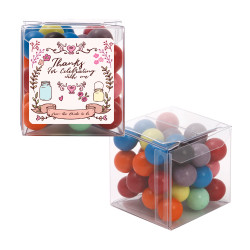 A clear sweet cubes filled with your choice of confectionery and custom printed sticker.  Box Dimensions –  50MM X 50MM  Weight – 80 GRAMS APPROXIMATELY Fillings Available Chocolate Rocks Mini Jelly Beans Acid...