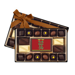 'Tis the Season to be Jolly! Deluxe Chocolate Box $81.00 100% Belgian Chocolate!You can't get more awe-inspiring than our Deluxe Chocolate Box.Make it what you will - a party centerpiece, an unforgettable gift or a way to share dessert, this box is sure to impress. An enormous 32 piece chocolate box... Options