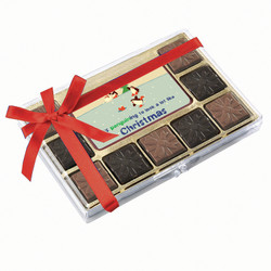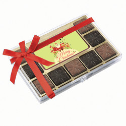 100% Belgian Chocolate! Delectable 9 ganache filled Belgian chocolates, packed in a clear gift box and a 'Merry Christmas' printed chocolate center piece. The luxurious milk and dark chocolates are filled with rich caramel and mint ganache flavors...
