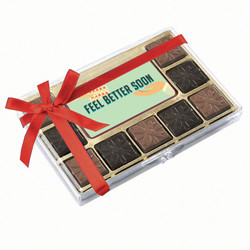 100% Belgian Chocolate! Delectable 9 ganache filled Belgian chocolates, packed in a clear gift box and a 'Feel Better Soon' printed chocolate center piece. The luxurious milk and dark chocolates are filled with rich caramel and mint ganache flavors...