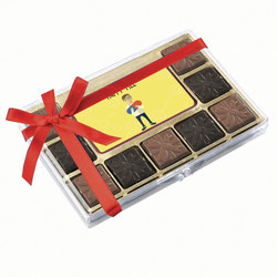 100% Belgian Chocolate! Delectable 9 ganache filled Belgian chocolates, packed in a clear gift box and a 'Please Feel Better Soon' printed chocolate center piece. The luxurious milk and dark chocolates are filled with rich caramel and mint ganache...