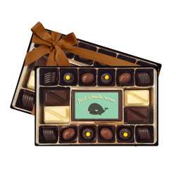 100% Belgian Chocolate! Delectable 9 ganache filled Belgian chocolates, packed in a clear gift box and a 'Feel Whale Soon' printed chocolate center piece. The luxurious milk and dark chocolates are filled with rich caramel and mint ganache flavors...